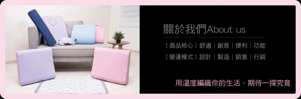 而後陸續開發出多元性商品,含SPA美容枕、舒腰枕、睡眠枕、旅遊枕、生活用品、穿飾等商品,從頭到腳周全考量,不僅符合人體工學,對於布料選擇及使用,都希望帶給人們輕鬆愉快的體驗。