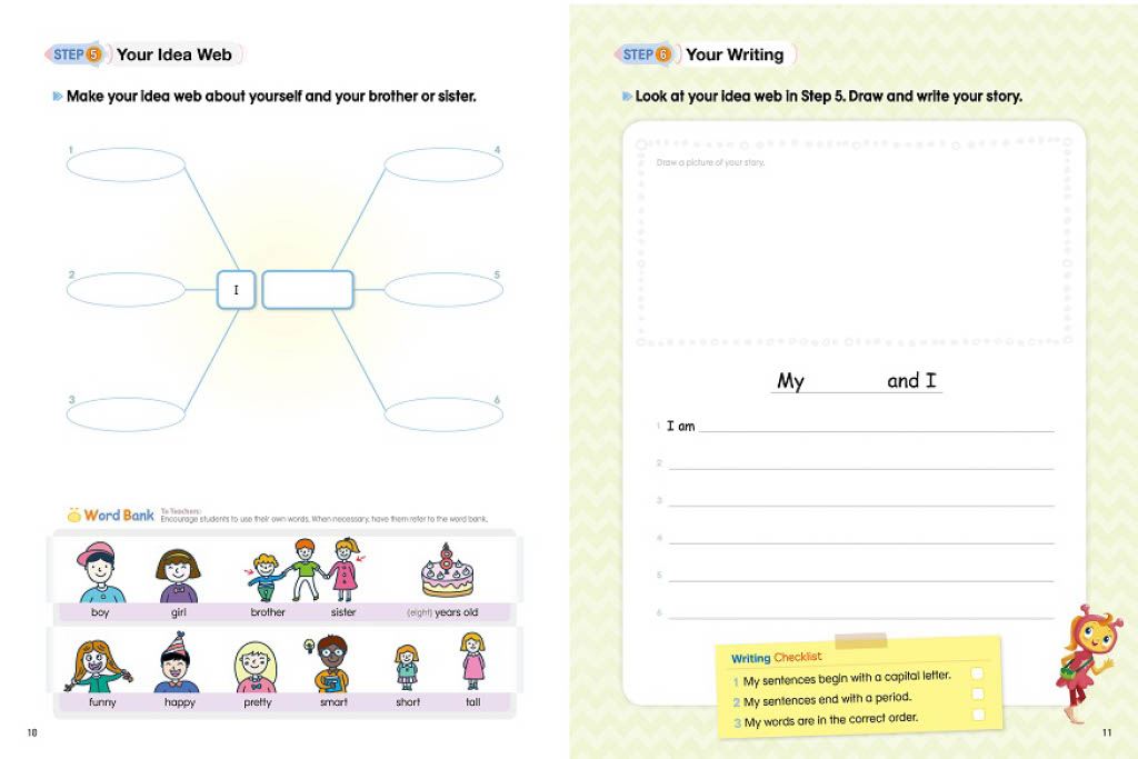 ◆六大步驟,完成段落寫作:1. Warm Up 2. Word Practice 3. Grammar Practice 4. Writing Practice 5. Your Idea Web 6. Your Writing 根據以上步驟,配合自己的想法畫出來,小朋友就能寫出屬於自己的主題性段落文章;將整本書的文章集合起來,自己就是位小作家喔。