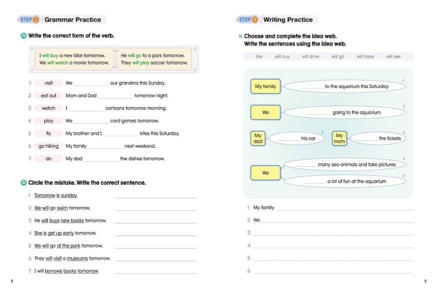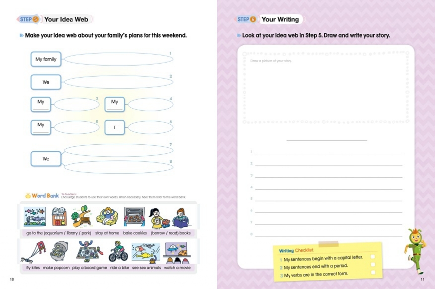 ◆六大步驟,完成段落寫作:1. Warm Up 2. Word Practice 3. Grammar Practice 4. Writing Practice 5. Your Idea Web 6. Your Writing 根據以上步驟,配合自己的想法畫出來,小朋友就能寫出屬於自己的主題性段落文章;將整本書的文章集合起來,自己就是位小作家喔。