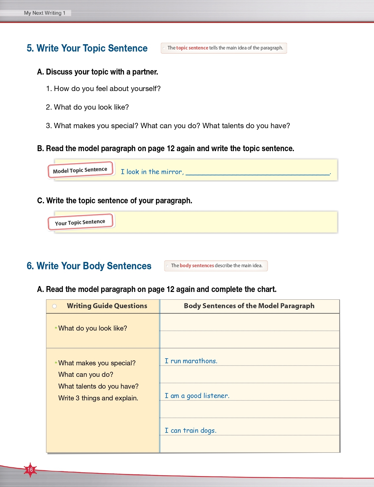 在第一冊,學生透過主題句型寫出一段完整的段落;
