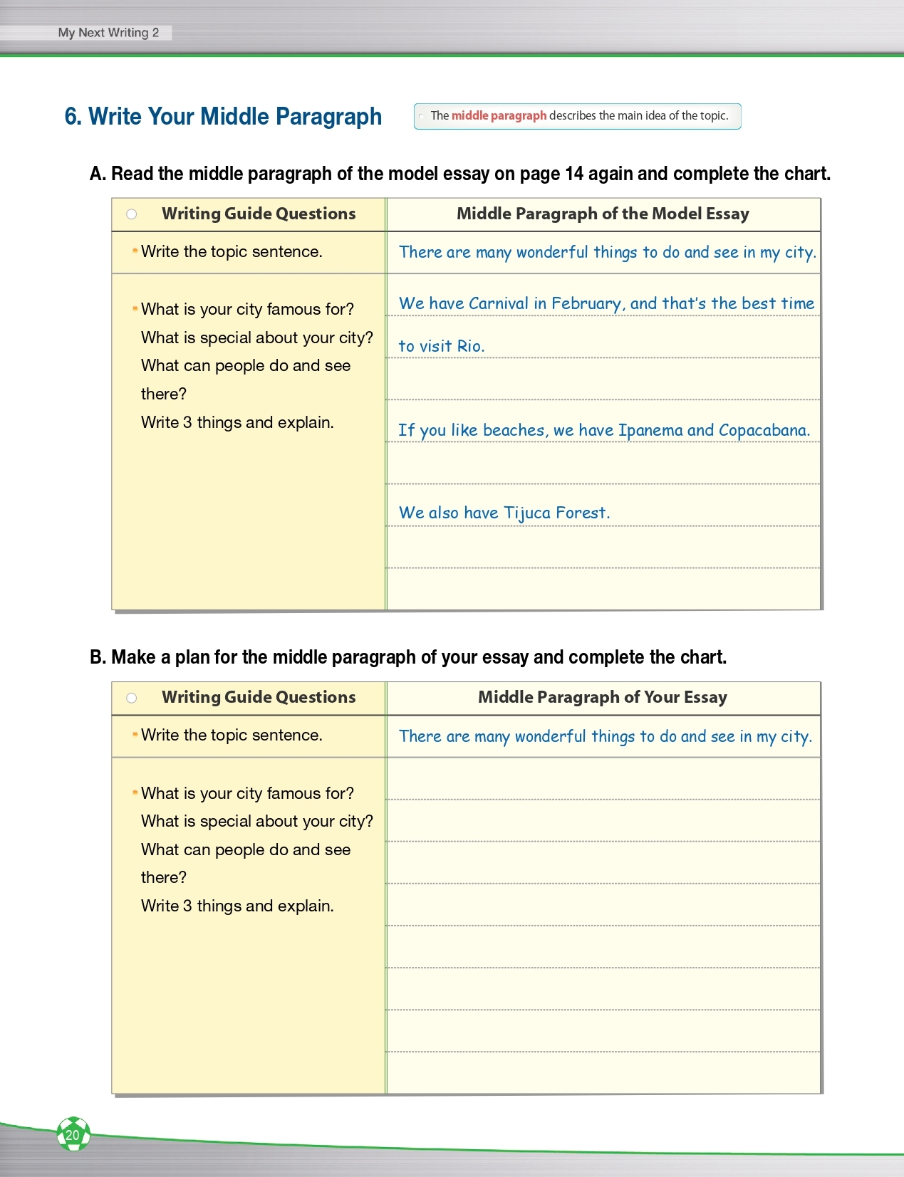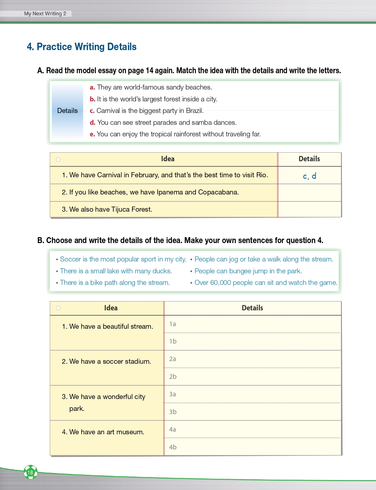 My Next Writing是繼My First Writing的寫作教材。 本系列是教導學生學會文章寫作的各種技巧。 在第一冊,學生透過主題句型寫出一段完整的段落; 在第二冊及第三冊,學生可以運用他們自己的想法寫出整篇短文及文章。 透過範例文章有循序漸進地引導他們寫出完整文章,本系列涵蓋廣泛的主題,讓學生可以充分練習寫作技巧。