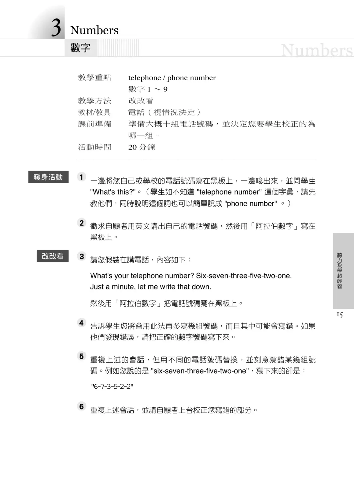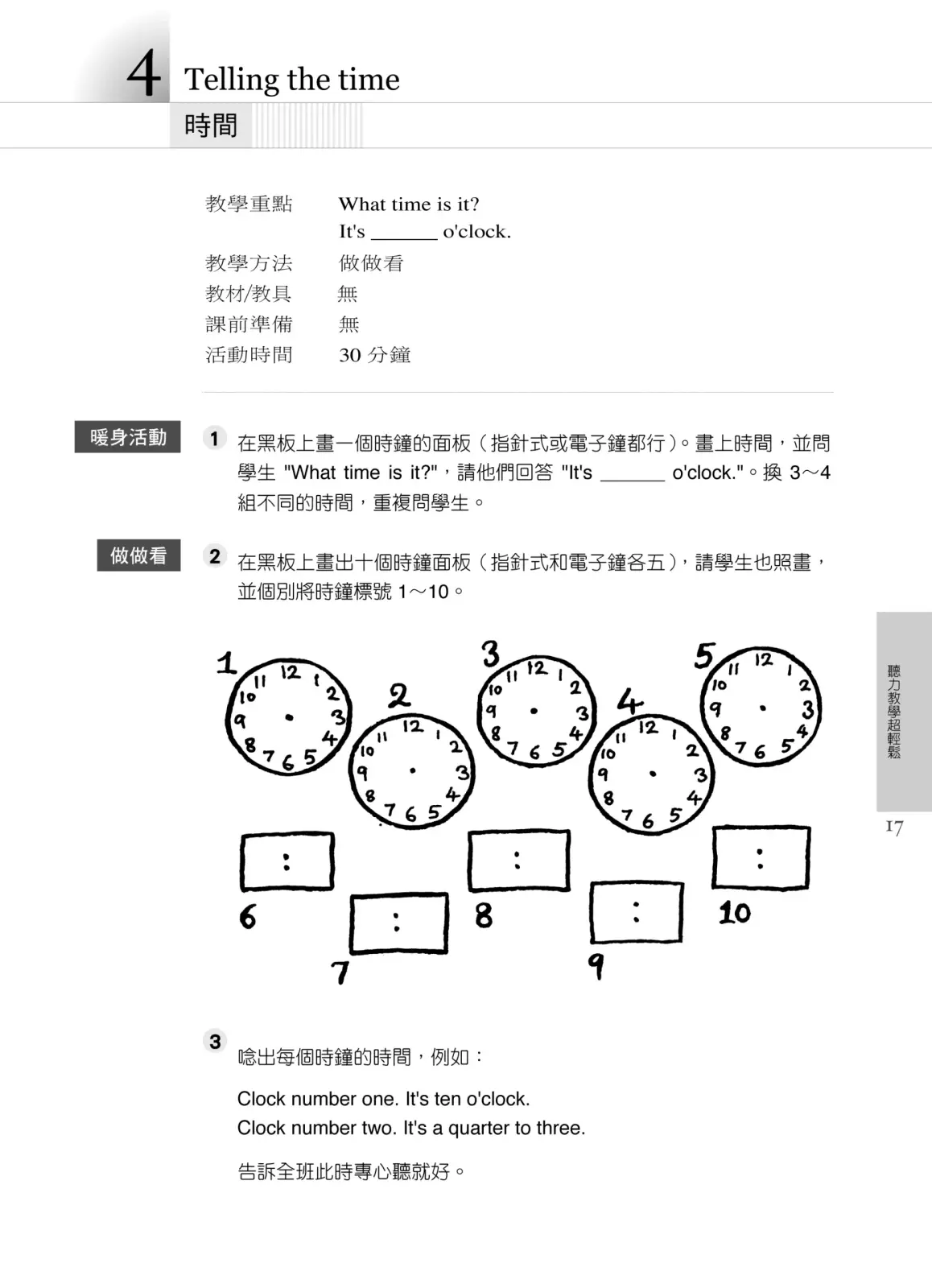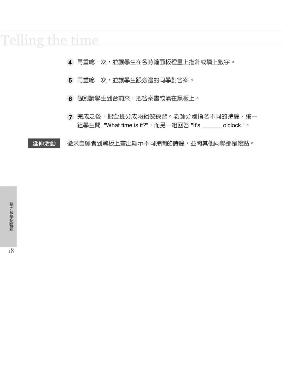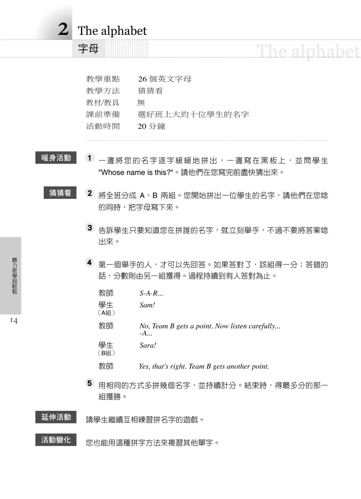 每個單元都包含一個活動,詳細列出活動前的準備事項、主旨和所需時間,活動中該注意的事情及活動後的後續反應等,可說是教授初級英語教師最佳的教學指南。