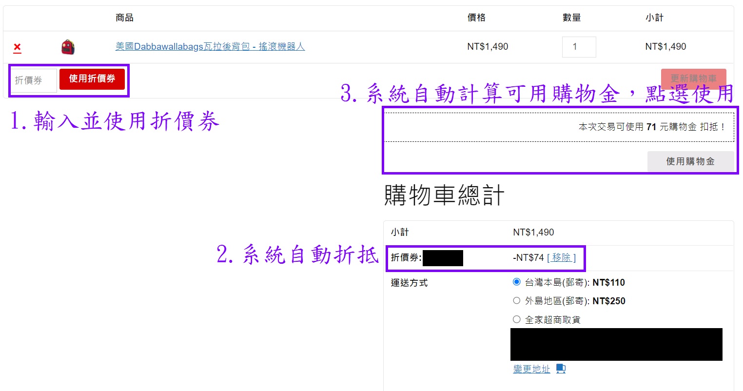 ※結帳時購物車系統會自動為您計算當筆交易可折抵的金額,若您「不想使用購物金」則「不要」點使用購物金的按鍵